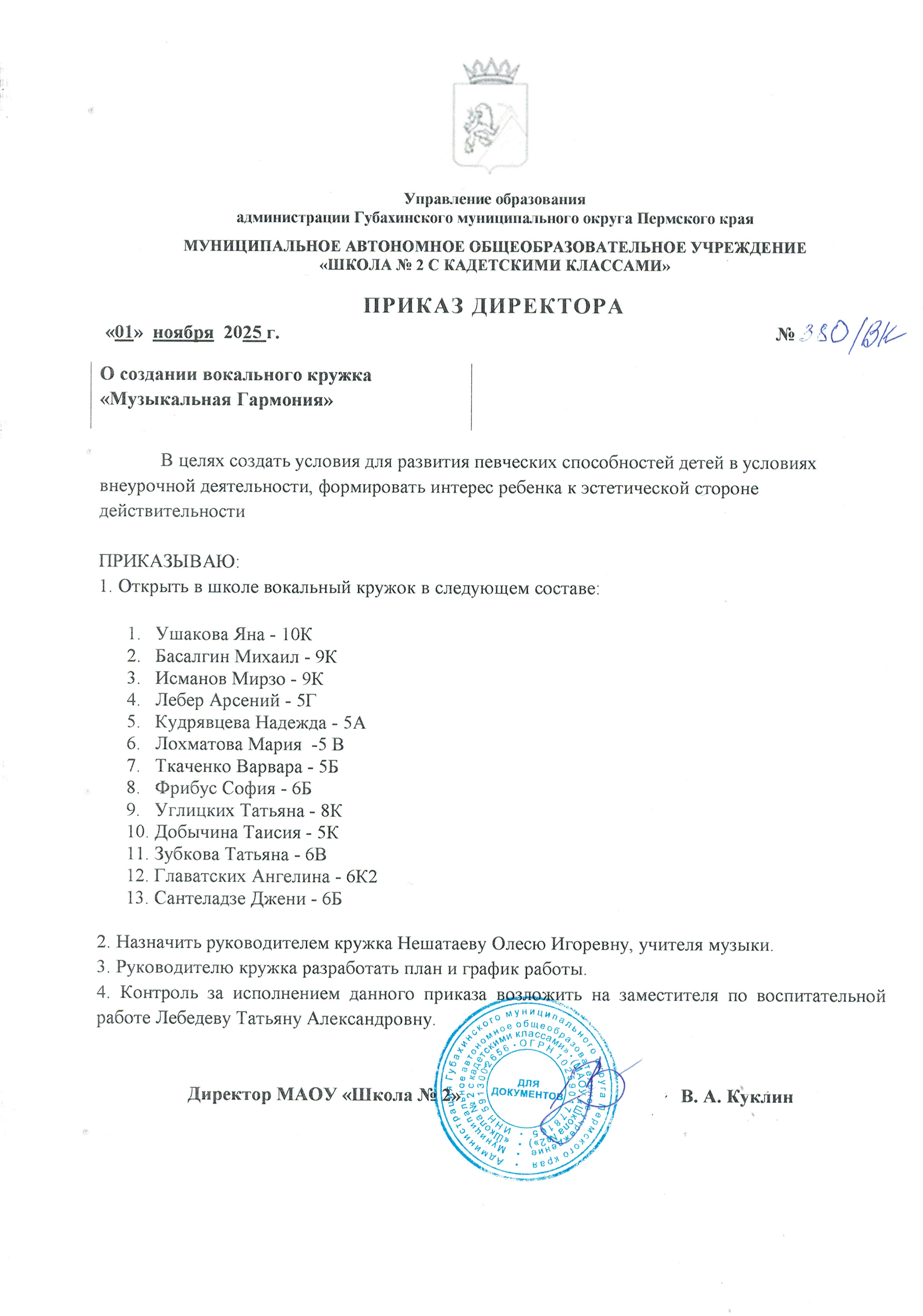 Приказ об организации вокального кружка "Музыкальная гармония" (смотреть подробнее)