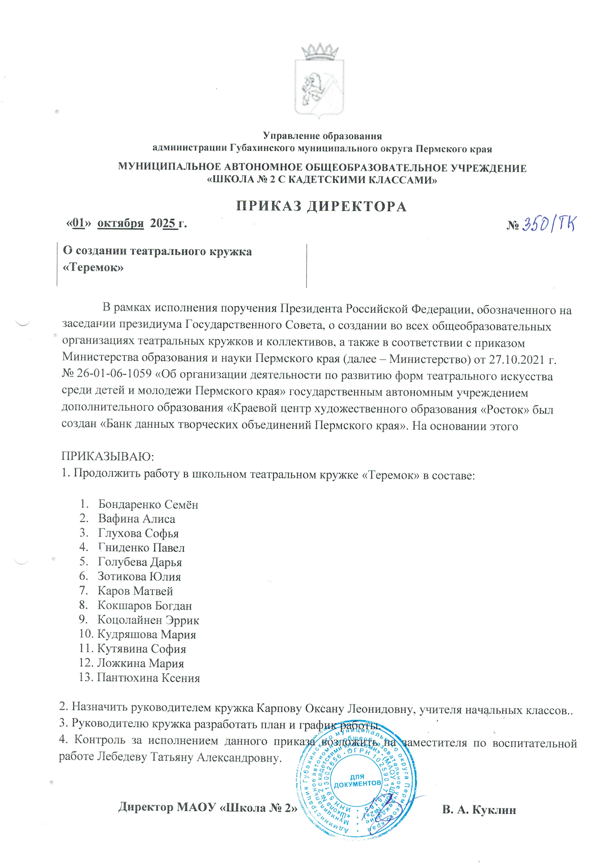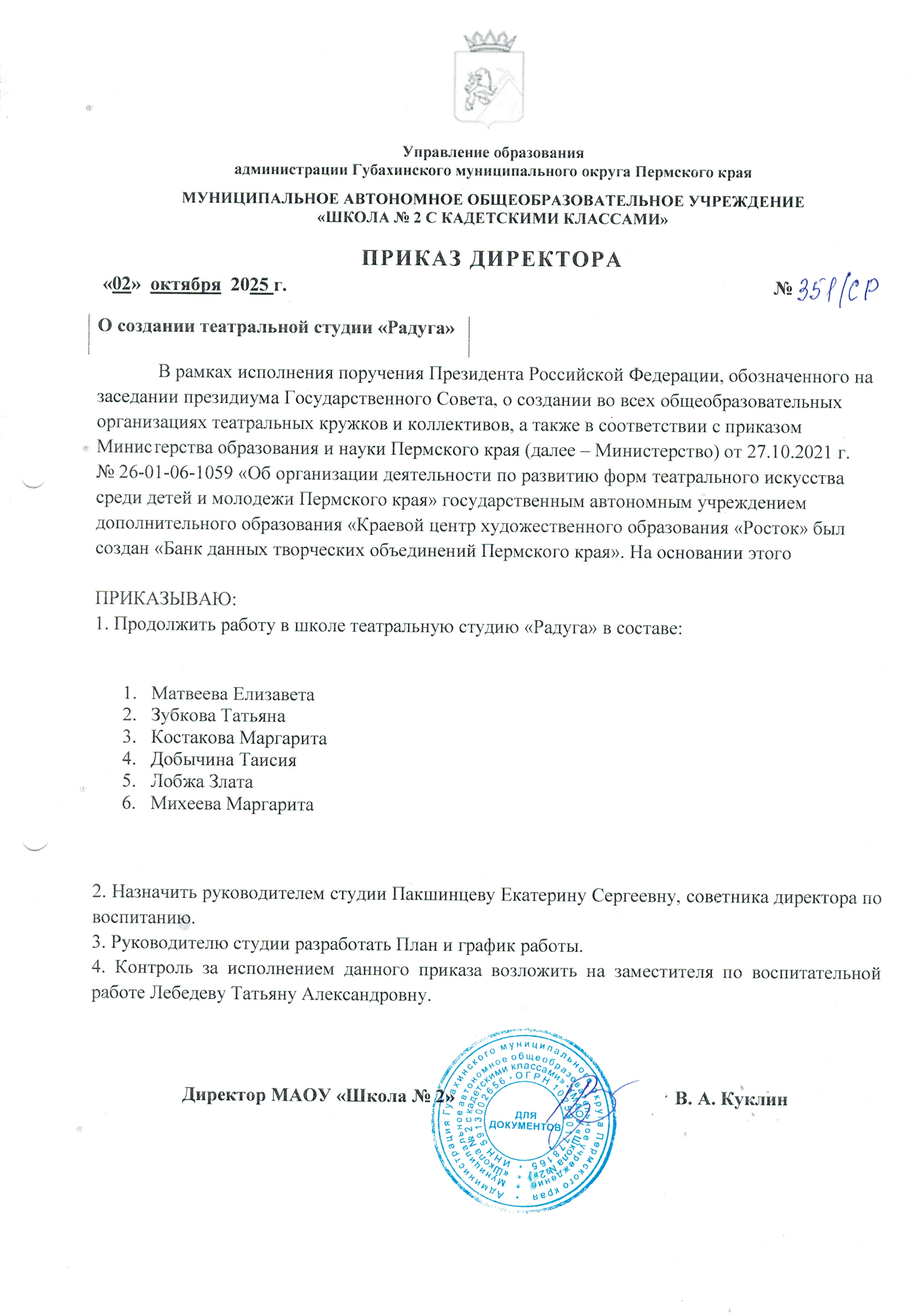 Приказ об организации театральной студии "Радуга" (смотреть подробнее)